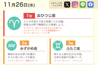 今朝のおはよう朝日ですの占いでは4位とまずまずの順位でしたが、もしかしてとめざましテレビをチェックすると、いい方にビンゴ!私見事1位になっていました。うれしいですねえ〜。もちろんいい方を優先します。でも浮かれすぎないように気をつけます。え〜っと今日は「人への手助けで実力発揮して大活躍。得意な分野で積極的に立候補しよう。」だそうです。わっかりました!今日一日思いっきり積極的に過ごしたいと思います。