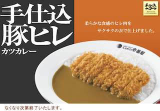 今週末もココイチネタで。新しい期間限定手仕込シリーズが出ていますのでそのご紹介です。諸事情によりカレーを食べにいけていません。新商品の紹介でお茶を濁します。今回ご紹介するのは「手仕込豚ヒレカツカレー」です。「柔らかな食感のヒレ肉をサクサクの衣で仕上げました。」というキャッチコピーです。ほぼ毎年出ている手仕込シリーズの大御所です。美味しくないわけがありません。私は諸事情により食べに行けませんが、皆さまにはぜひご賞味いただきたいと思います。