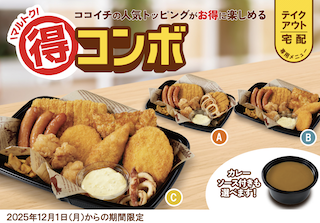 今週末もココイチネタで。新しい期間限定シリーズが出ていませんので、テイクアウト専用メニューのご紹介です。諸事情によりカレーを食べにいけていません。新商品の紹介でお茶を濁します。今回ご紹介するのは「マル得コンボ」です。「ココイチの人気トッピングがお得に楽しめる」というキャッチコピーです。ほぼ食したことのあるトッピングメニューですが揃えるととても豪華に感じますね。私は諸事情により食べに行けませんが、皆さまにはぜひご賞味いただきたいと思います。